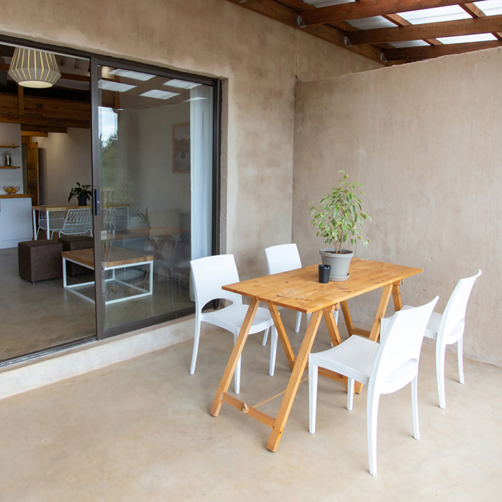 Welcome to The Old Dairy at Rosemary Hill Farm, renovated by interior architect Marijke Hugo to optimize space and natural light. The interior features natural colors and textures with modern, clean lines. Outside, the large patio offers a built-in braai and ample seating for enjoying farm sunsets, and access to a wood-fired hot tub. Ideal for families or couples, it invites you to relax and unwind amidst the beauty of our farm.